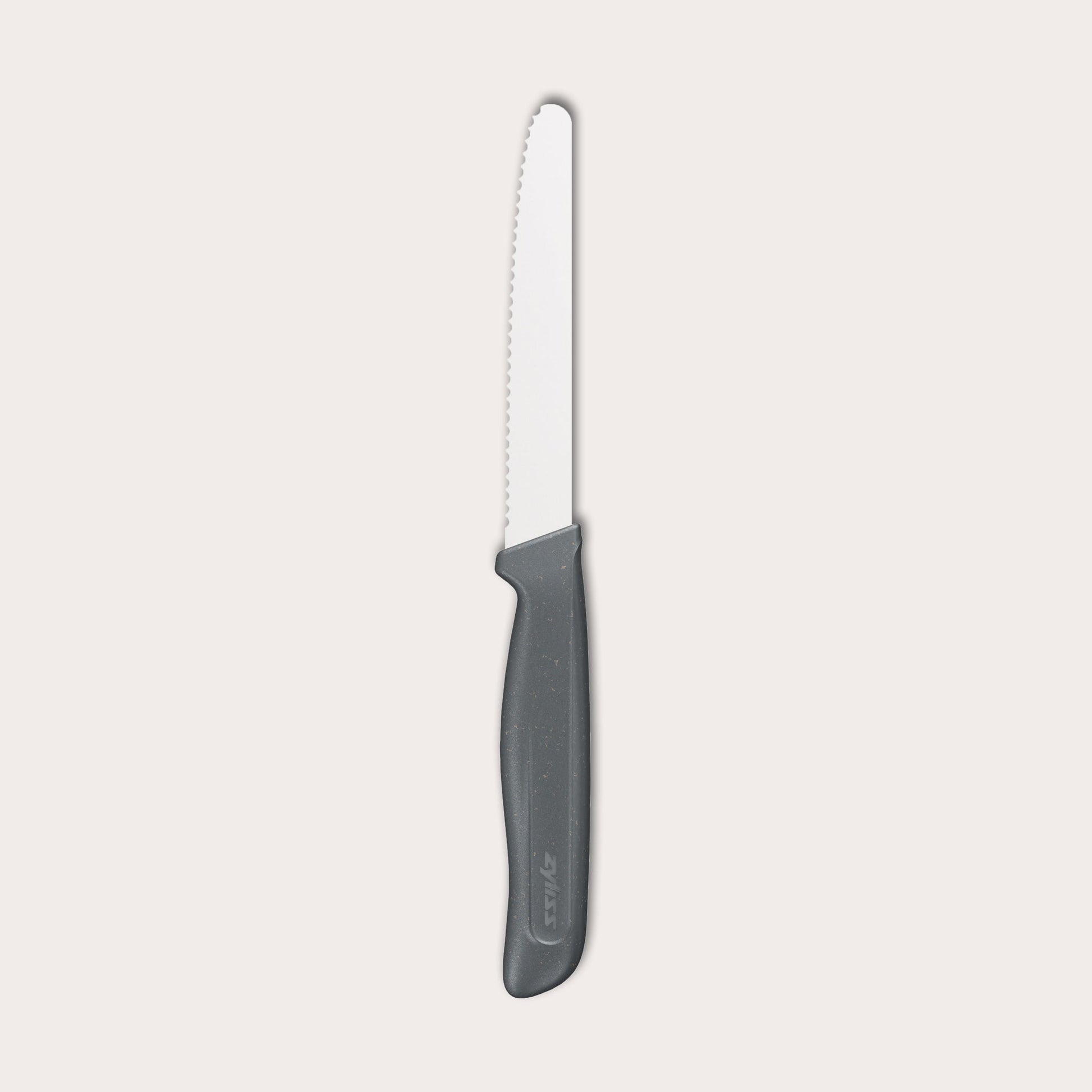 Discover the Zyliss Tomato Knife, crafted for precision cutting and dicing of larger fruits and vegetables such as tomatoes. Its long round-tipped, serrated blade effortlessly slices through delicate tomato skins, ensuring a cleaner cutting experience. The eco-friendly handle, made from wheat straw material, reduces plastic usage by up to 20%. This knife is food-safe, and dishwasher-safe, and includes an easy-insert blade guard for secure storage. With a 5-year Zyliss guarantee, it's an ideal choice for effortless tomato slicing.